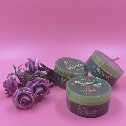 Ons haarmasker is de perfecte oplossing om je haar gezond en sterk te houden. Het werkt in op de haarwortels om je haar te versterken, haaruitval te verminderen en de algehele gezondheid van je haar en hoofdhuid te bevorderen. Dit masker verkoelt de hoofdhuid, waardoor jeuk en irritatie verminderen. Ideaal om te gebruiken in combinatie met MOHANLAL® Shampoo, Conditioner, Arganolie, Rozenwater en Leave-in Crème van pure Arganolie.